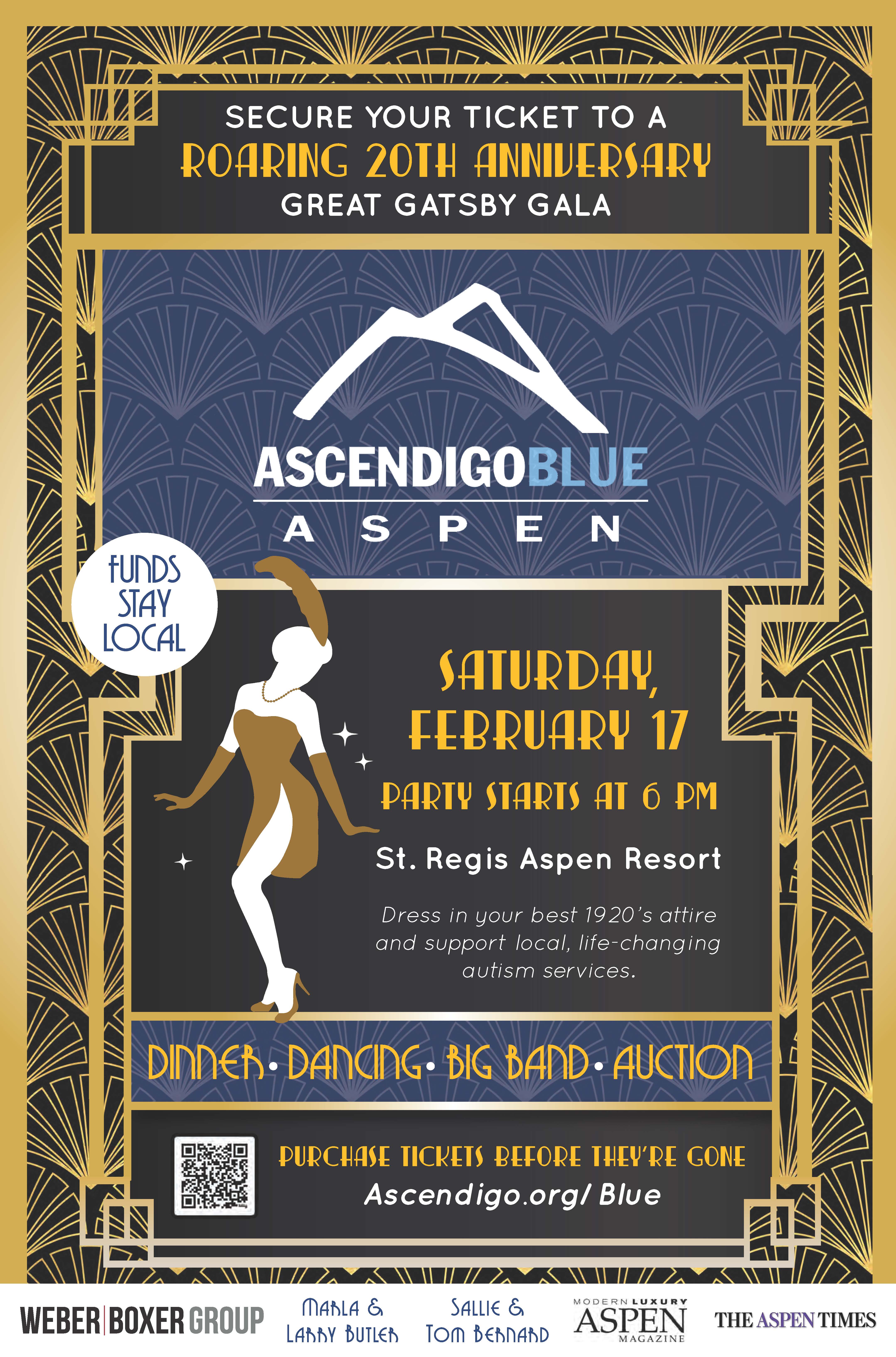 On February 17th at the St. Regis Aspen Resort, Ascendigo Autism Services is hosting its 20th anniversary of the Blue Aspen Benefit titled the “Great Gatsby Gala.” Come and celebrate two decades of Ascendigo Autism Services with a glamorous evening that includes interactive 1920s-themed entertainment! The extraordinary Walton Stout Band will help elevate the evening for dancing and celebration. Comedian Miler Ford and the entertainers from Art of Air will also perform at the prestigious event.